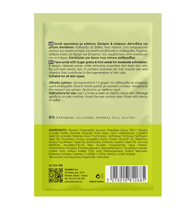 Scrub προσώπου με κόκκους Ζάχαρης & σπόρους Ακτινίδιου για μέτρια απολέπιση. Καθαρίζει σε βάθος τους πόρους ενώ απομακρύνει ρύπους και νεκρά κύτταρα για απαλή και βελούδινη επιδερμίδα. Περιέχει αιθέρια έλαια για θρέψη και βιταμίνες που συμβάλλουν στην ανανέωση των κυττάρων.